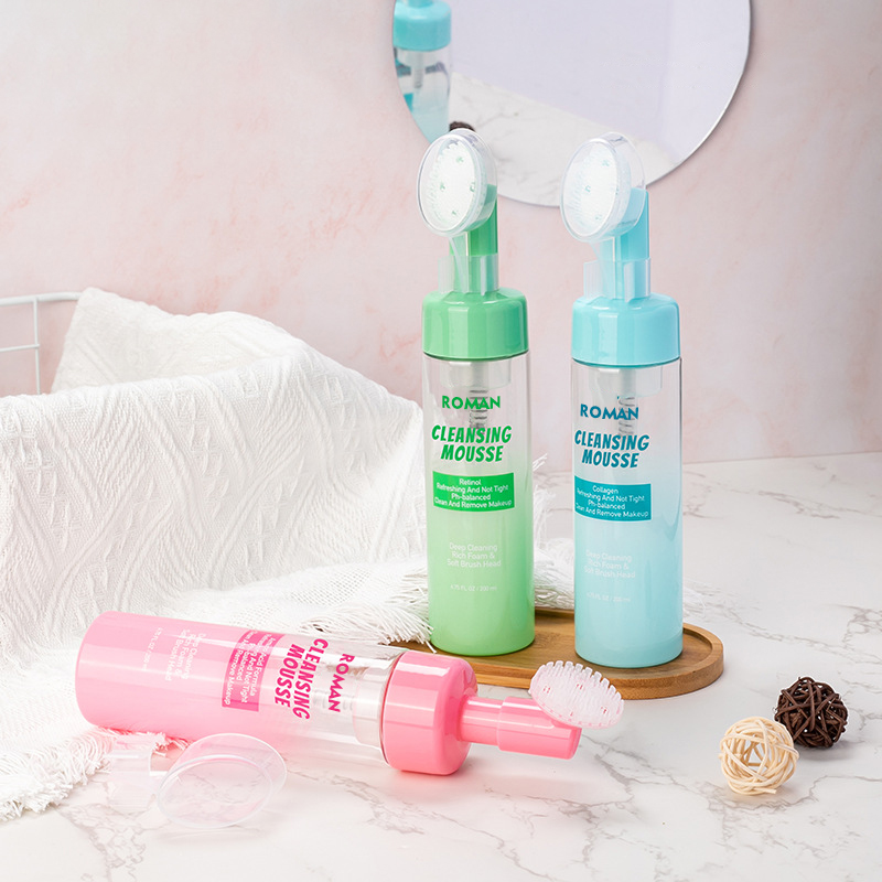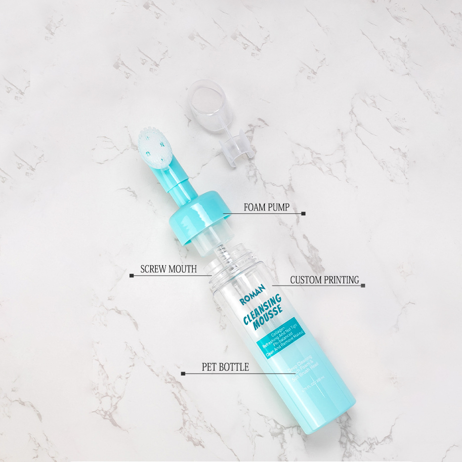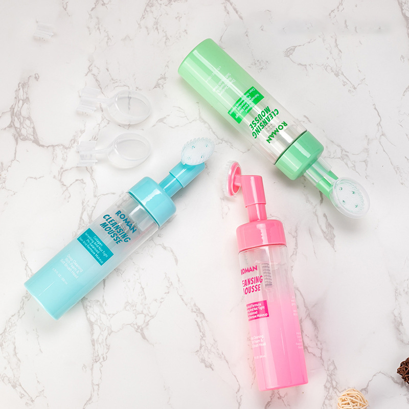 50ml 60ml 80ml 100ml 120ml 150ml Skin Soft Touch Body Cleanser Ansigtsvask Massage Pet Plastic Skumflasker med Silikone Brush Lotion Pump , glem rodede hænder og fortyndede rensemidler. Den innovative skumflaske udstyret med et indbygget silikonebørstehoved forvandler det daglige ansigtsrens ritual til en enestående effektiv og behagelig oplevelse. Tryk blot på pumpen, og en sky af tæt, perfekt luftet skum genereres øjeblikkeligt og leveres direkte på de bløde, fleksible silikonebørster. Det betyder, at du ikke længere skal skumme i håndflader eller kæmpe for at påføre vandige geler – det rige skum er klar til øjeblikkelig, målrettet påføring. Brugere glider den blide silikonebørste hen over deres hud og nyder både den effektive rensende virkning af skummet og en beroligende mikromassage, der stimulerer cirkulationen uden irritation, hvilket gør den ideel til at fjerne dagligt snavs og forberede huden.